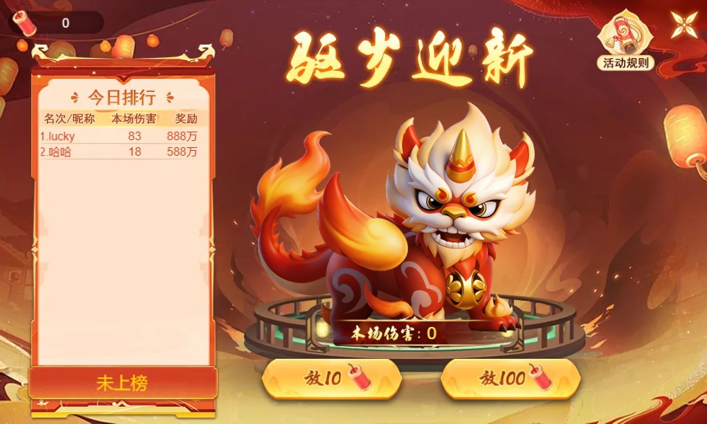 使用鞭炮驱逐年兽,每日对年兽造成伤害最高的前50名可获得大量游戏币奖励,每放10个鞭炮随机获得游戏币、魅力值等奖励。