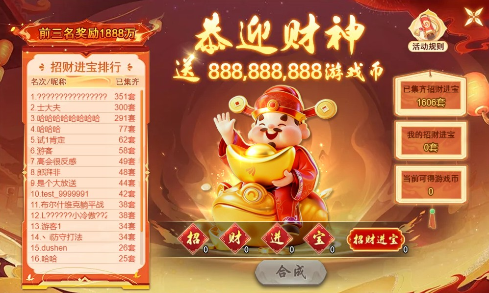 集“招财进宝”道具一同瓜分8.88亿游戏币奖励,数量最多的前3名玩家可额外获得1888万游戏币奖励。