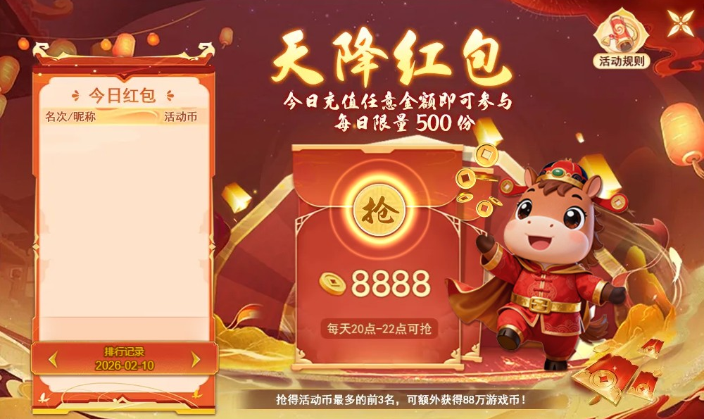 抢红包活动每天20点-22点开启,每日限量500份,抢得数量最多的前3名可额外获得88万游戏币奖励。